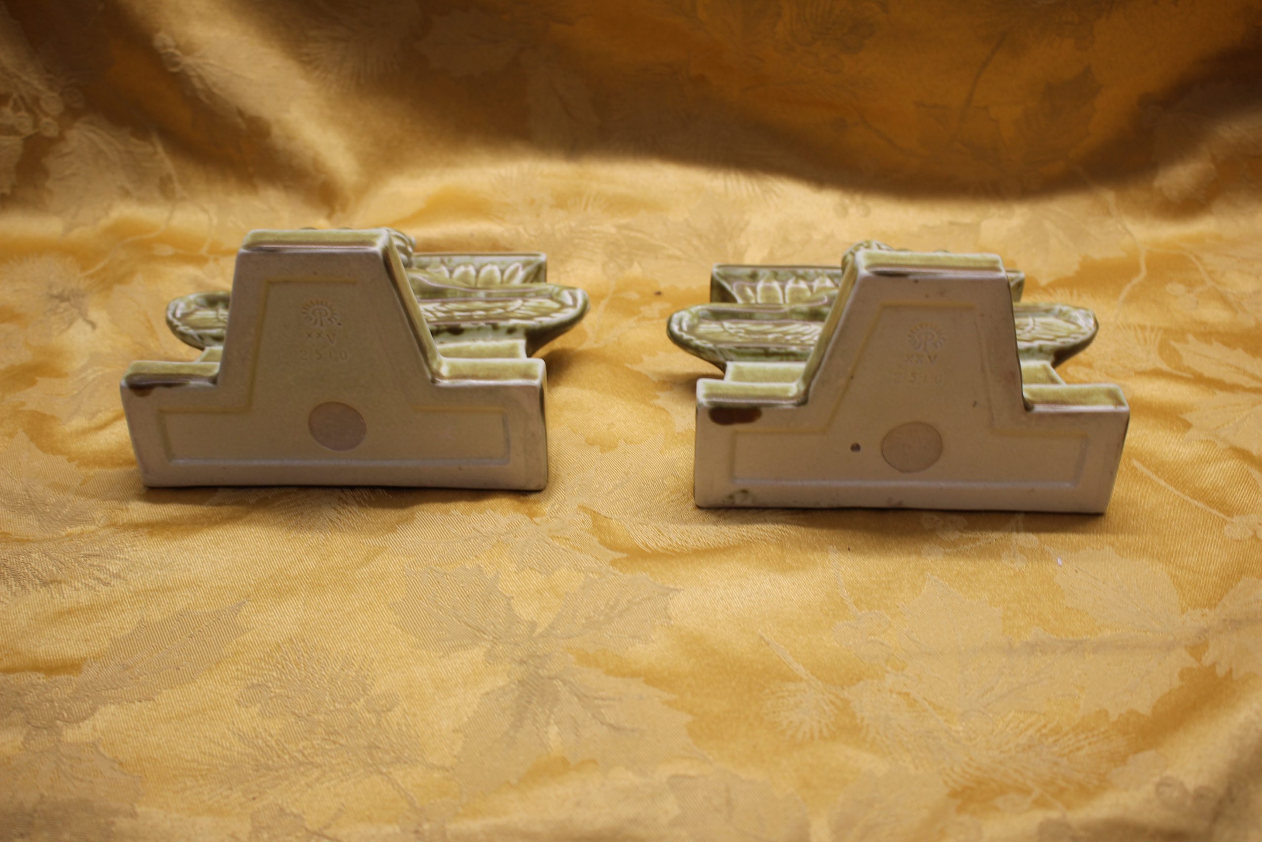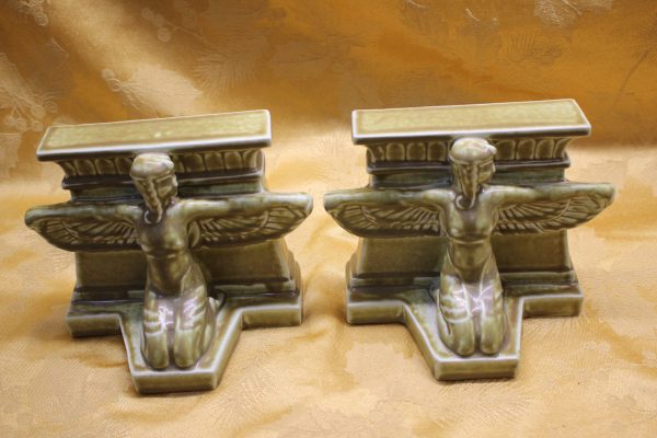 For sale is a preowned pair of Rookwood Pottery 2510 Bookends. They feature an Egyptian Themed Winged Female and were made in 1925. They are approximately 5-1/2″ tall by 6-1/4″ wide by 4″ at their deepest.